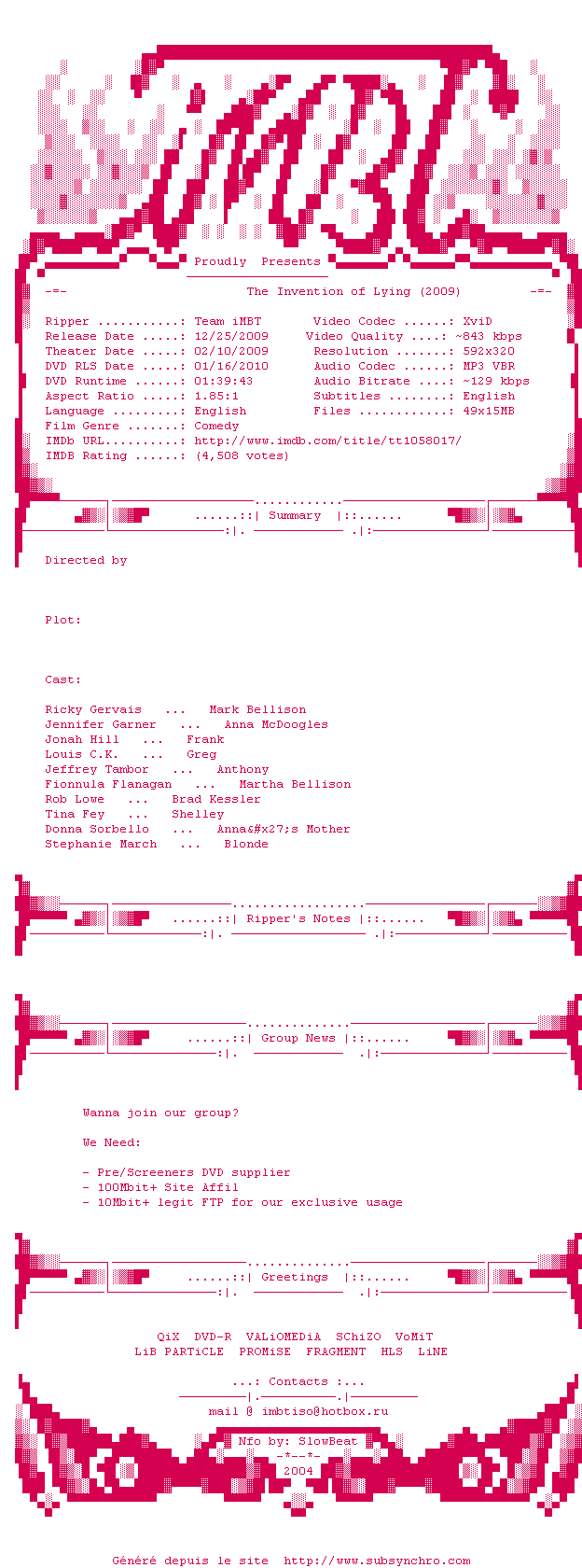 Voir le nfo de la release The.Invention.Of.Lying.2009.BRRip.H264.AAC-SecretMyth