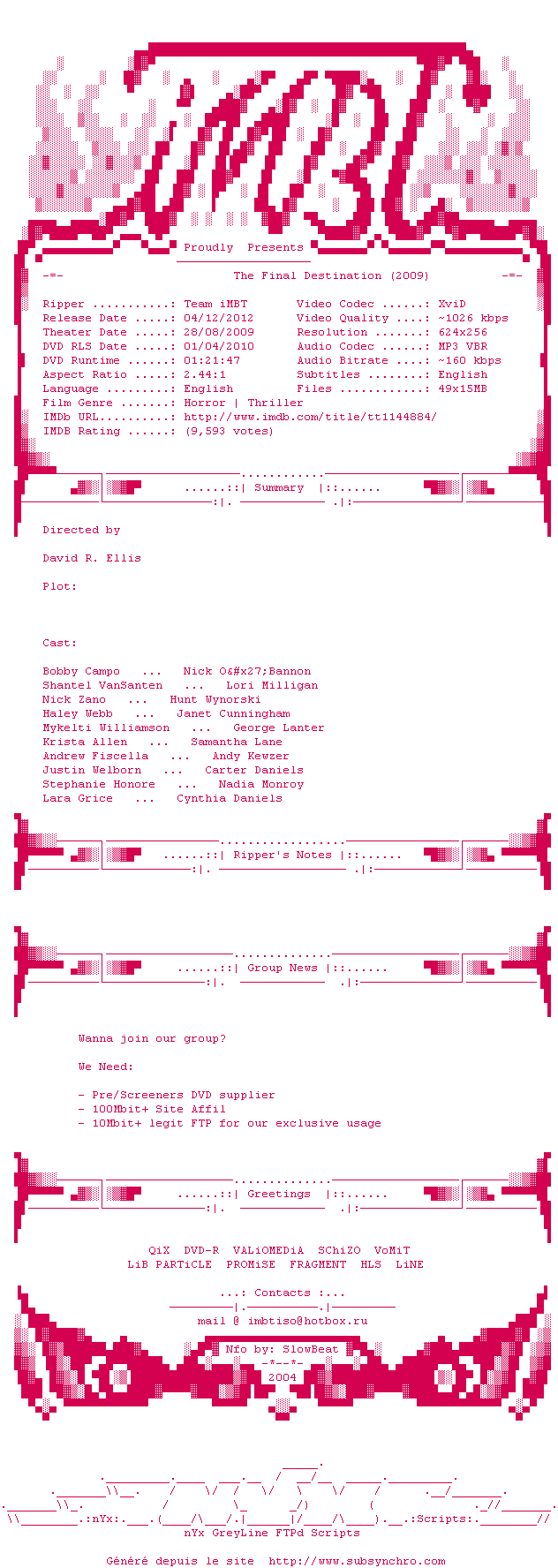 Voir le nfo de la release The.Final.Destination.BDRip.XviD-iMBT