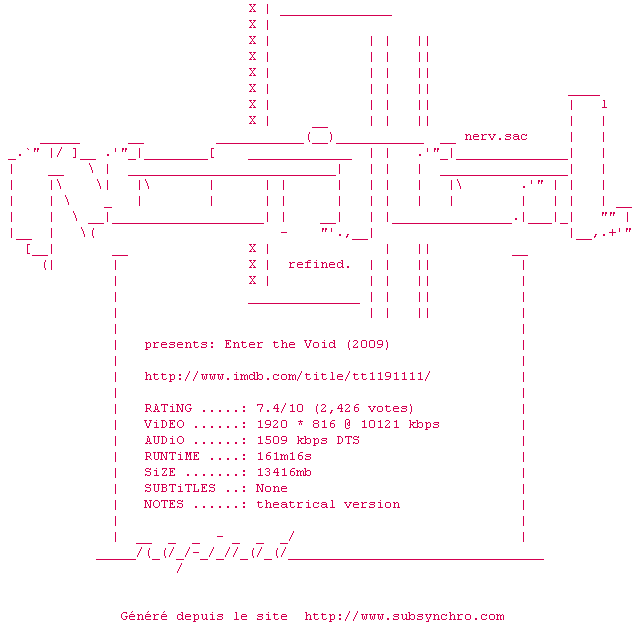 Voir le nfo de la release Enter.The.Void.2010.Extended.1080p.BluRay.x265-r00t