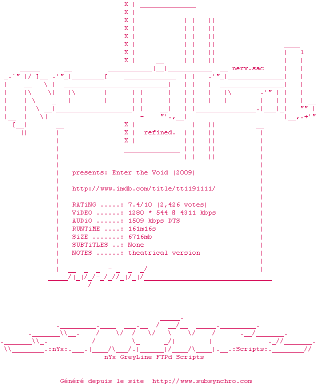 Voir le nfo de la release Enter.The.Void.LIMITED.720p.BluRay.x264-REFiNED