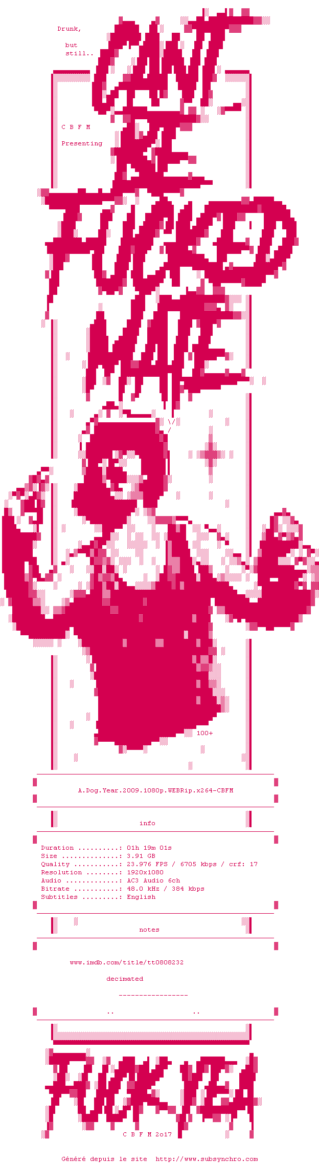 | Voir le nfo de la release A.Dog.Year.2009.1080p.WEBRip.x264-CBFM | CBFM | A.Dog.Year.2009.1080p.WEBRip.x264-CBFM OpenSubtitles | 0 fichier | ||