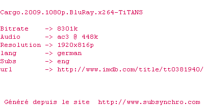 Voir le nfo de la release Cargo.2009.1080p.BluRay.x264-TiTANS