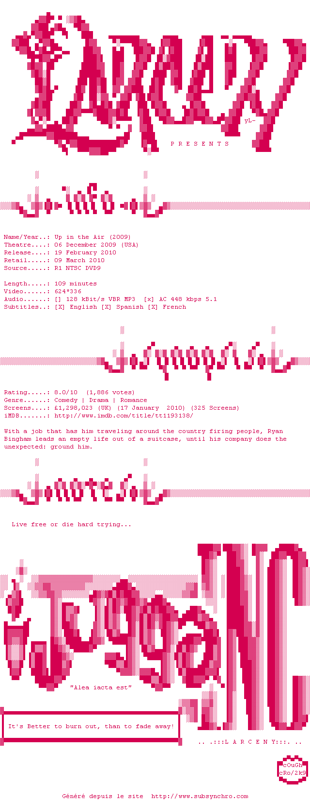 Voir le nfo de la release Up.In.The.Air.2009.DVDRip.XviD-Larceny