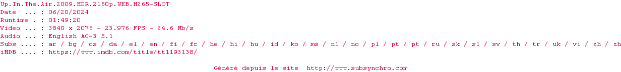 Voir le nfo de la release Up.In.The.Air.2009.HDR.2160p.WEB.H265-SLOT