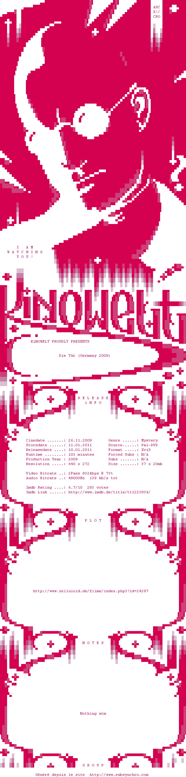 Voir le nfo de la release Die.Tuer.German.2009.DVDRip.XviD-KiNOWELT