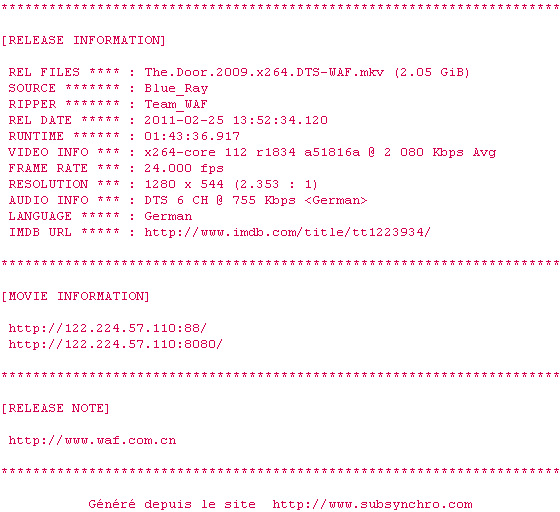 Voir le nfo de la release The.Door.2009.x264.DTS-WAF