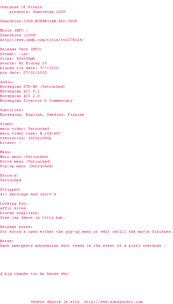 Voir le nfo de la release Snarveien.2009.NORWEGiAN.BDr-ODOP