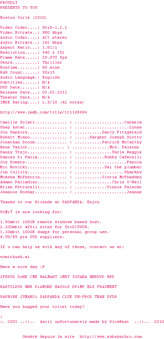Voir le nfo de la release Boston.Girls.2010.DVDRip.XviD-VoMiT