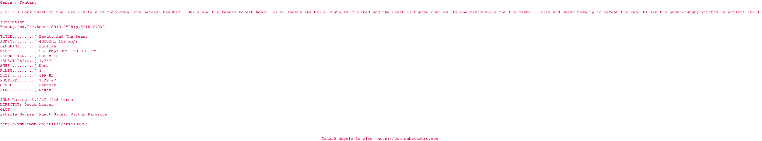 Voir le nfo de la release Beauty.And.The.Beast.2010.DVDRiP.XViD-ViP3R