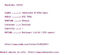 | Voir le nfo de la release Mandrake.2010.1080p.BluRay.x264-MELiTE | MELiTE | Mandrake.2010.1080p.BluRay.x264-MELiTE OpenSubtitles | 0 fichier | ||