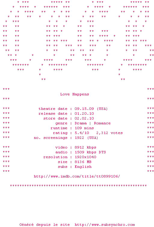 Voir le nfo de la release Love.Happens.1080p.Bluray.x264-CBGB