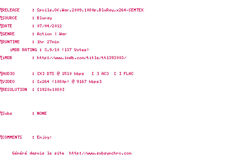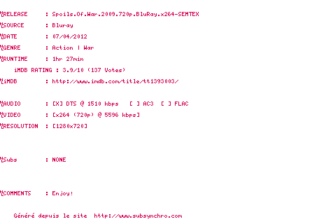 Voir le nfo de la release Spoils.Of.War.2009.1080p.BluRay.x264-SEMTEX