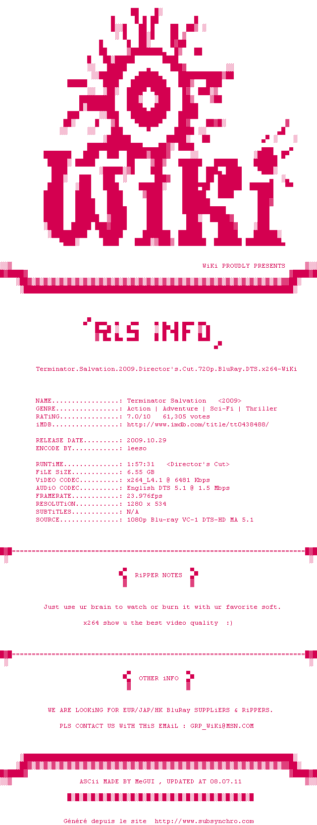 Voir le nfo de la release Terminator.Salvation.2009.Directors.Cut.1080p.BluRay.DTS.x264-WiKi