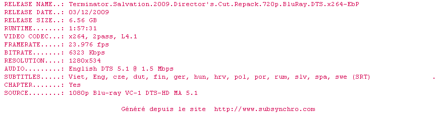 Voir le nfo de la release Terminator.Salvation.2009.Directors.Cut.1080p.BluRay.DTS.x264-HDC
