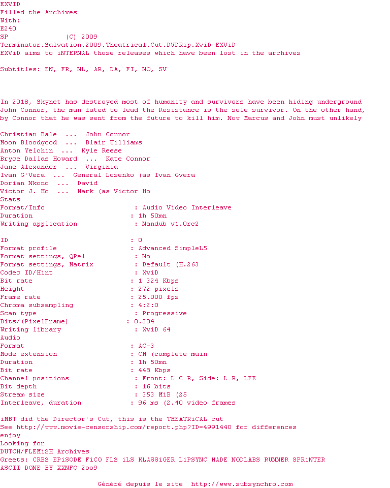 Voir le nfo de la release Terminator.Salvation.2009.Theatrical.Cut.DVDRip.XviD-EXViD