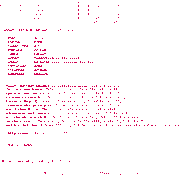 Y avez-vous pense ? Nous proposons déjà 1198 sous-titres pour le film Gooby. Avez-vous essaye de voir si ces sous-titres etaient compatibles avec cette release ? On vous laisse le soin de tester cela pour nous et de contribuer au site en postant le sous-titre en cas de compatiblite constatee !