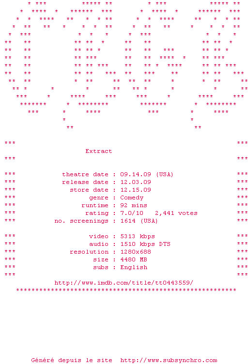 | Voir le nfo de la release Extract.720p.Bluray.x264-CBGB | CBGB | Extract.720p.Bluray.x264-CBGB OpenSubtitles | 0 fichier | ||