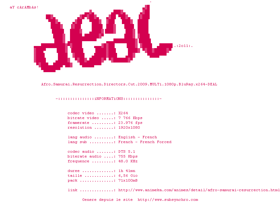 Y avez-vous pense ? Nous proposons déjà 3 sous-titres pour le film Afro Samuraï: Resurrection. Avez-vous essaye de voir si ces sous-titres etaient compatibles avec cette release ? On vous laisse le soin de tester cela pour nous et de contribuer au site en postant le sous-titre en cas de compatiblite constatee !