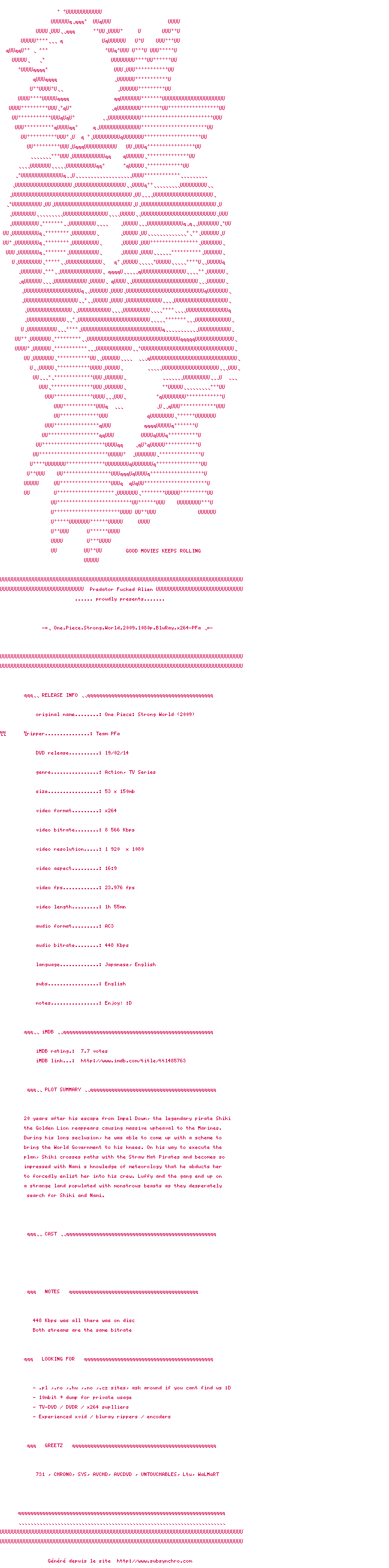 Voir le nfo de la release One.Piece.Strong.World.2009.1080p.BluRay.x264-PFa