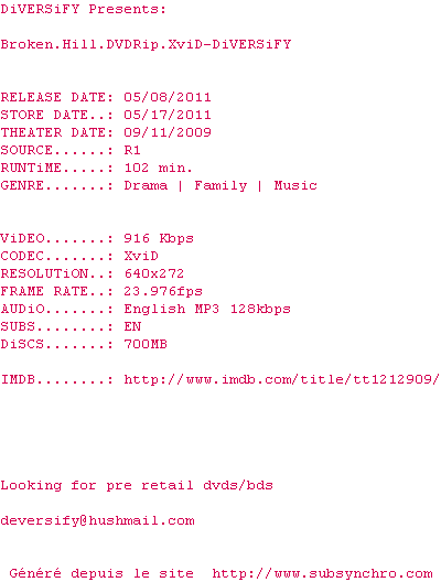 Voir le nfo de la release Broken.Hill.LIMITED.DVDRip.XviD-DiVERSiFY