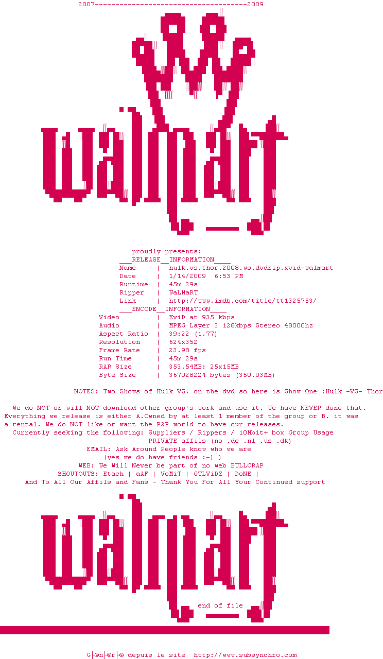 | Voir le nfo de la release Hulk.vs.Thor.2008.WS.DVDRiP.XviD-WaLMaRT | WaLMaRT | Hulk.vs.Thor.2008.WS.DVDRiP.XviD-WaLMaRT OpenSubtitles | 0 fichier |