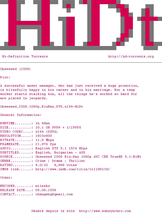 | HD1080 | Obsessed.2009.1080p.BluRay.x264-HD1080 OpenSubtitles | 0 fichier | |||