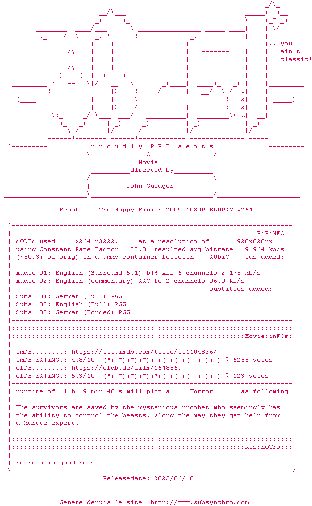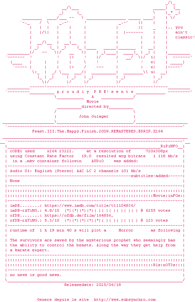 Voir le nfo de la release Feast.III.The.Happy.Finish.2009.REMASTERED.BDRIP.x264-WATCHABLE