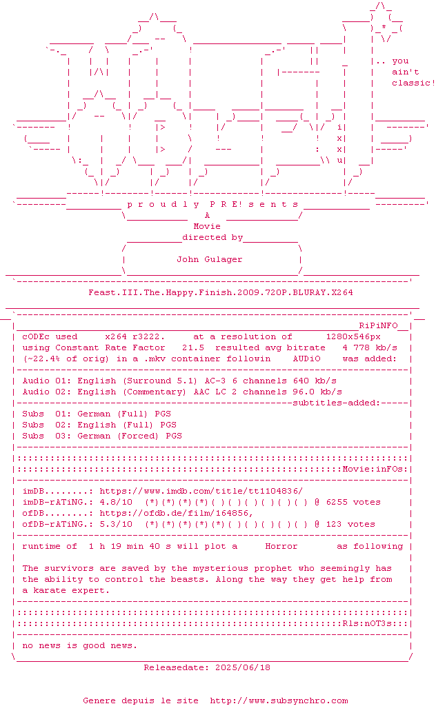 Voir le nfo de la release Feast.III.The.Happy.Finish.2009.720P.BLURAY.x264-WATCHABLE