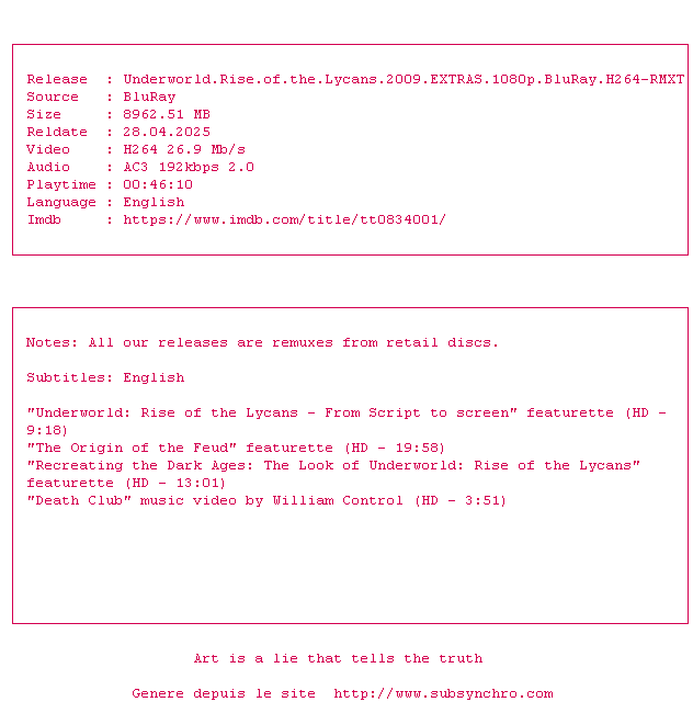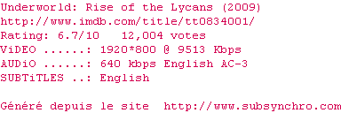 Voir le nfo de la release Underworld.Rise.Of.The.Lycans.2009.EXTRAS.1080p.BluRay.H264-RMXTRAS