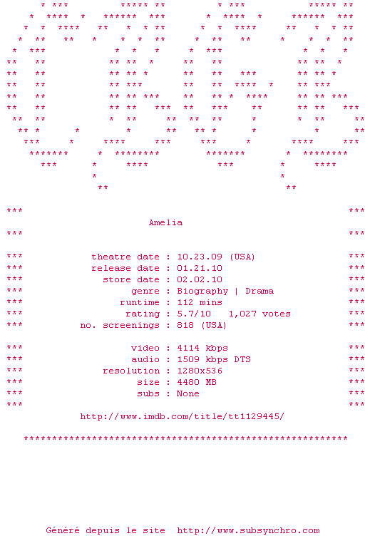 | Voir le nfo de la release Amelia.DVDRip.XviD-NeDiVx | NeDiVx | Amelia.DVDRip.XviD-NeDiVx OpenSubtitles | 21/01/2010 | 1 fichier | |