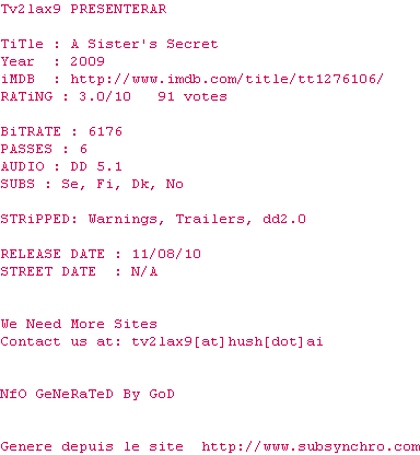 | Voir le nfo de la release A.Sisters.Secret.2009.STV.NORDiC.PAL.DVDR-TV2LAX9 | TV2LAX9 | A.Sisters.Secret.2009.STV.NORDiC.PAL.DVDR-TV2LAX9 OpenSubtitles | 0 fichier |
