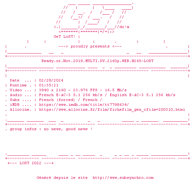 Voir le nfo de la release Ready.Or.Not.2019.MULTI.HDR.2160p.WEB.H265-LOST