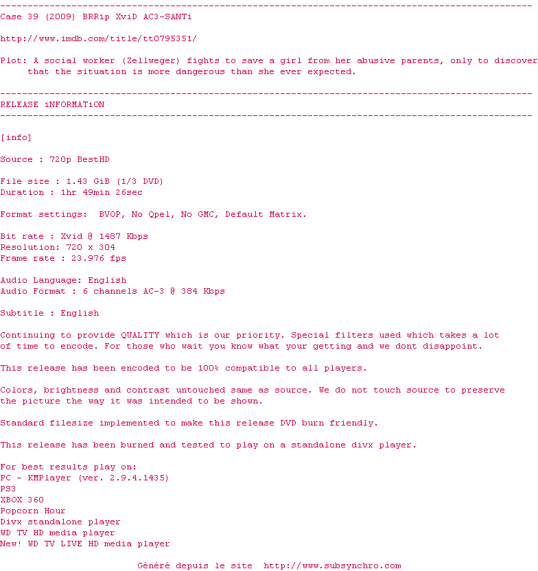 Voir le nfo de la release Case.39.2009.1080p.BluRay.x264-BestHD