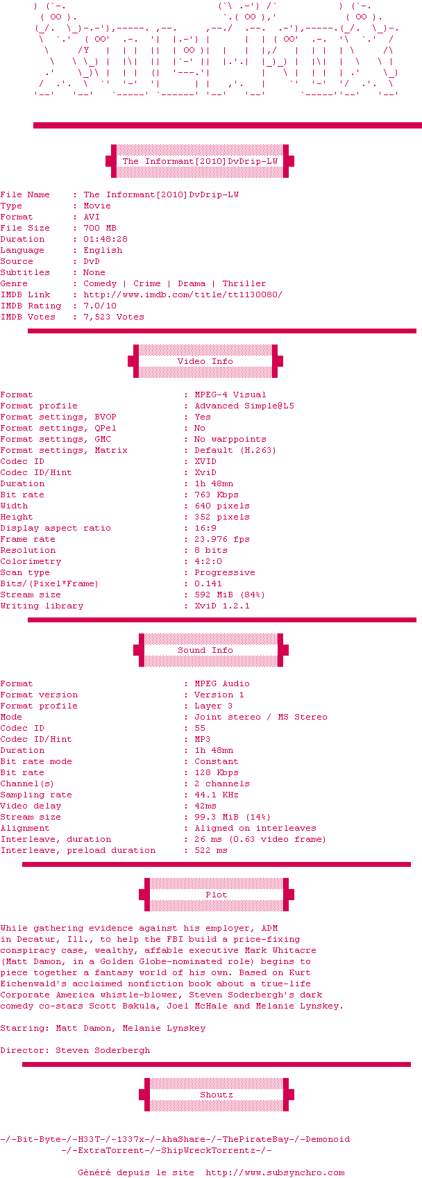 Le commentaire de Yaumegui Commente par Yaumegui (554), Le Dimanche 24 Aout 2014 à 00h23 Une très bonne comédie avec Matt Damon qui démontre une nouvelle fois qu'il est parmi les meilleurs. 8 / 10 0 0