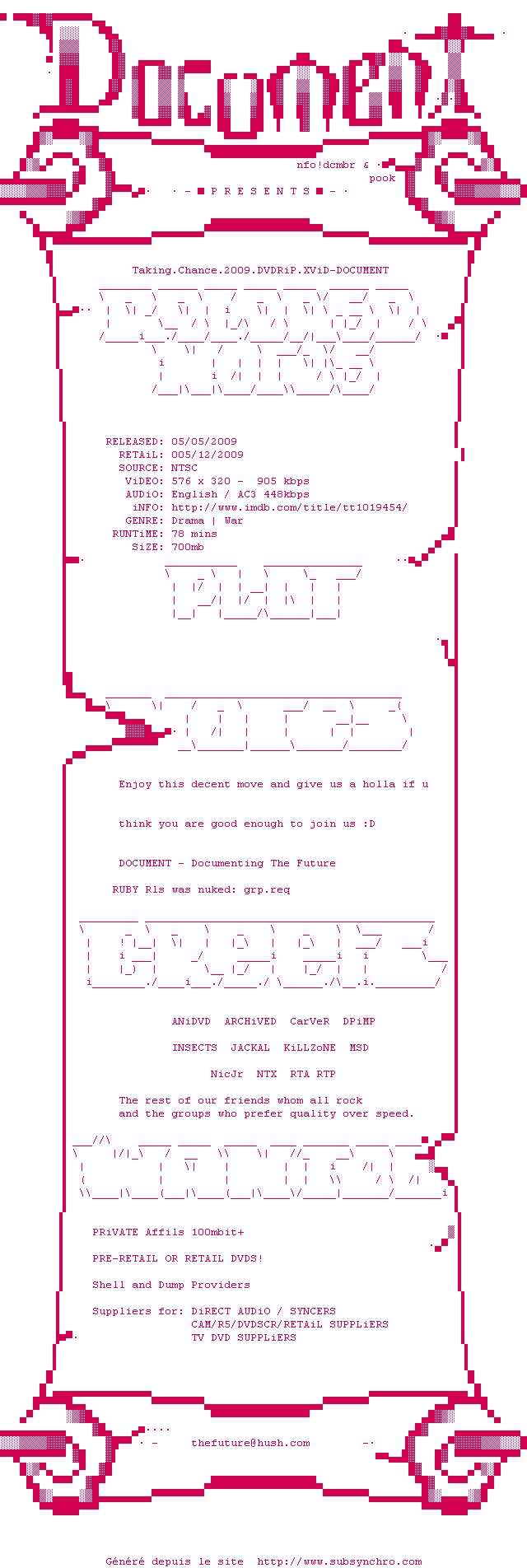 | Voir le nfo de la release Taking.Chance.2009.DVDRiP.XViD-DOCUMENT | DOCUMENT | Taking.Chance.2009.DVDRiP.XViD-DOCUMENT OpenSubtitles | 0 fichier |