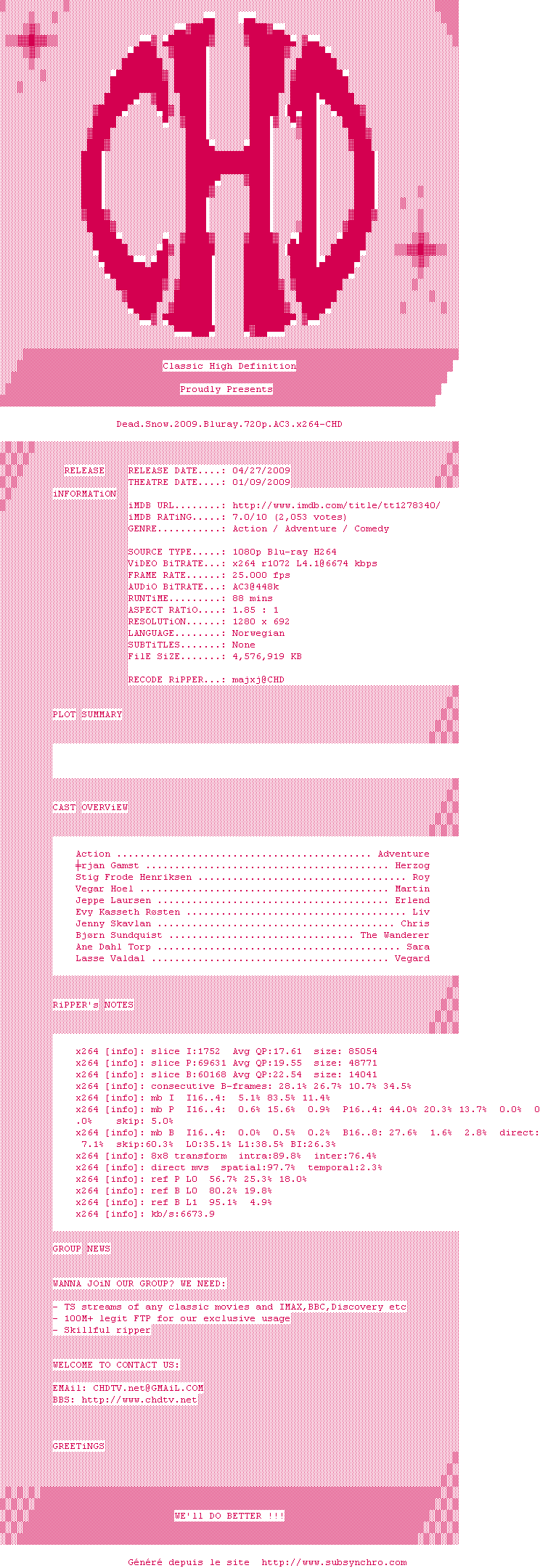 Voir le nfo de la release Dead.Snow.2009.Bluray.720p.AC3.x264-CHD
