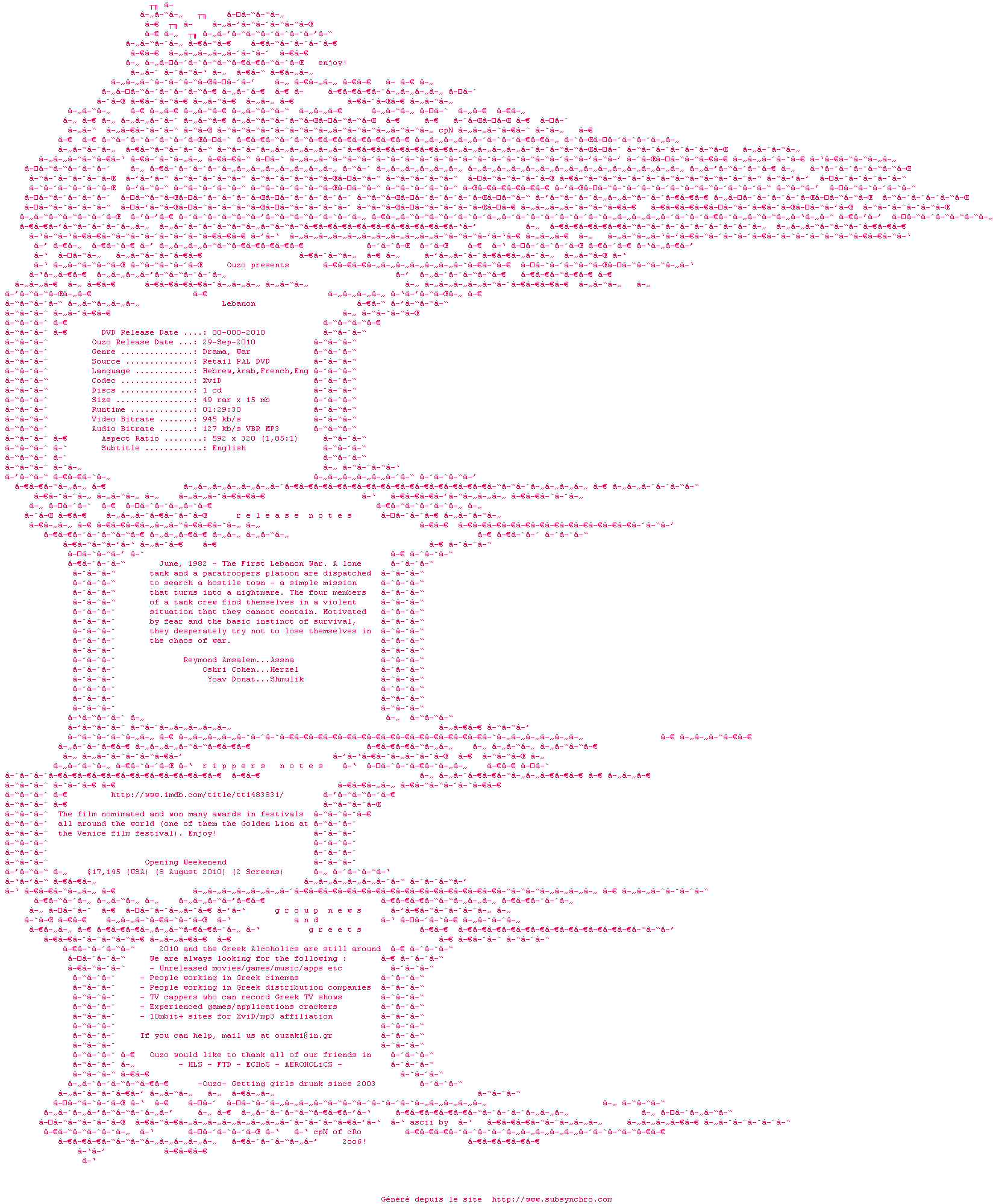 | Voir le nfo de la release Lebanon.2009.LiMiTED.DVDRiP.XviD-Ouzo | Ouzo | Lebanon.2009.LiMiTED.DVDRiP.XviD-Ouzo OpenSubtitles | 0 fichier |