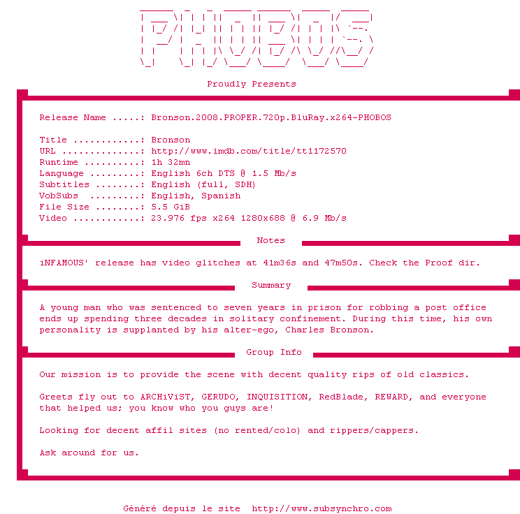 Voir le nfo de la release Bronson.2008.PROPER.720p.BluRay.x264-PHOBOS