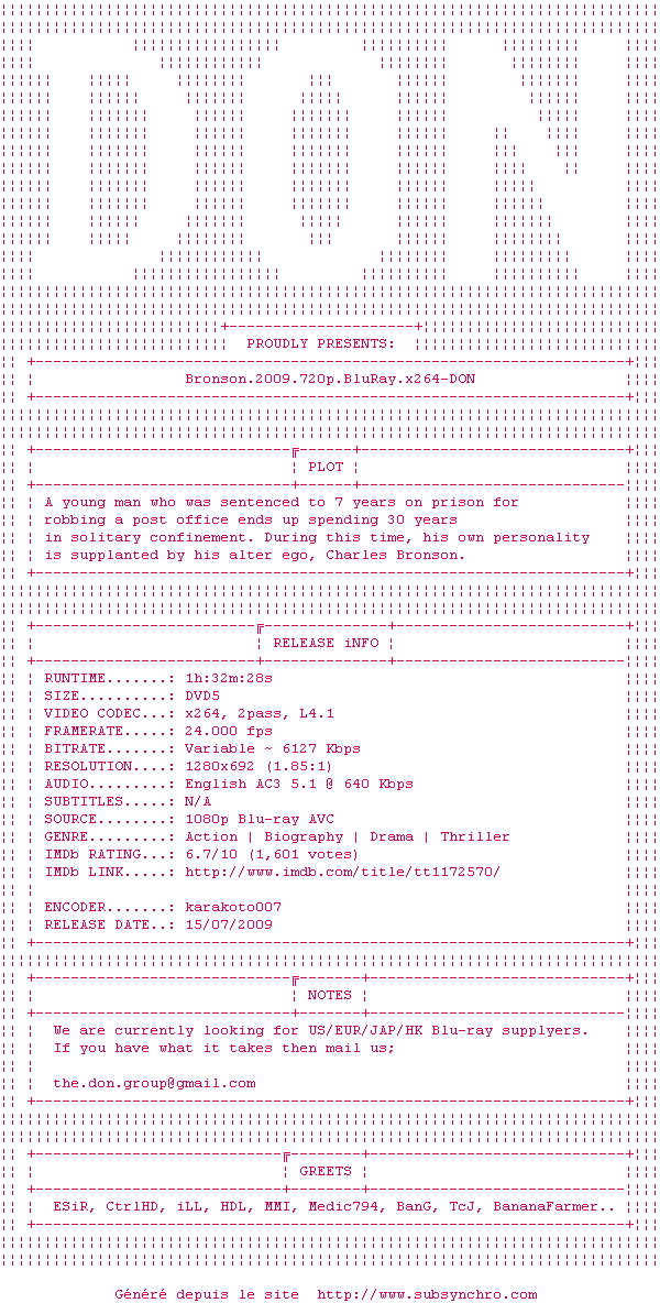 Voir le nfo de la release Bronson.2008.PROPER.1080p.BluRay.x264-SADPANDA