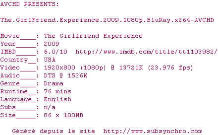 Chelsea est call-girl de luxe à Manhattan. À ses clients, elle offre bien plus que de banales relations sexuelles : elle leur propose d'être pour eux la compagne d'un soir. C'est la "Girlfriend Experience"... Chelsea est convaincue de maîtriser sa vie. Son business marche bien, elle gagne 2000 dollars de l'heure et son petit ami accepte même sa manière de vivre. Mais quand on multiplie les rencontres, on ne sait jamais sur qui l'on va tomber...