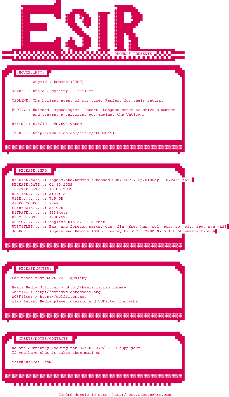 Angels.and.Demons.Extended.Cut.2009.720p.BluRay.DTS.x264-ESiR.srt Ajouté par XeiS Ajoute le 11-06-2010 04:24:10 Format : SRT Italique : Non Taille : 0.00Ko Telechargement : 91 Ajouter cette release à ma collection en cas de telechargement des sous-titres 0 0 0 Telecharger le ZiP contenant NFO, Affiche, Sous-titre (*.srt) Commentez le fichier Angels.and.Demons.Extended.Cut.2009.720p.BluRay.DTS.x264-ESiR.srt Commentez le fichier Angels.and.Demons.Extended.Cut.2009.720p.BluRay.DTS.x264-ESiR.srt Commentez ce fichier Le fichier 52-1276223050.srt n'existe pas ! Telechargez le RSS « Fichier de la release Angels.and.Demons.Extended.Cut.2009.720p.BluRay.DTS.x264-ESiR » Retour au film « Anges et démons »