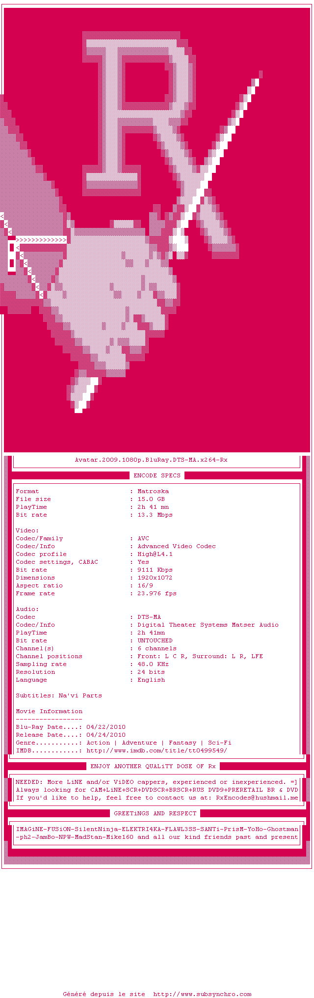 Nfo de la release Avatar.2009.1080p.BluRay.DTS-MA.x264-Rx