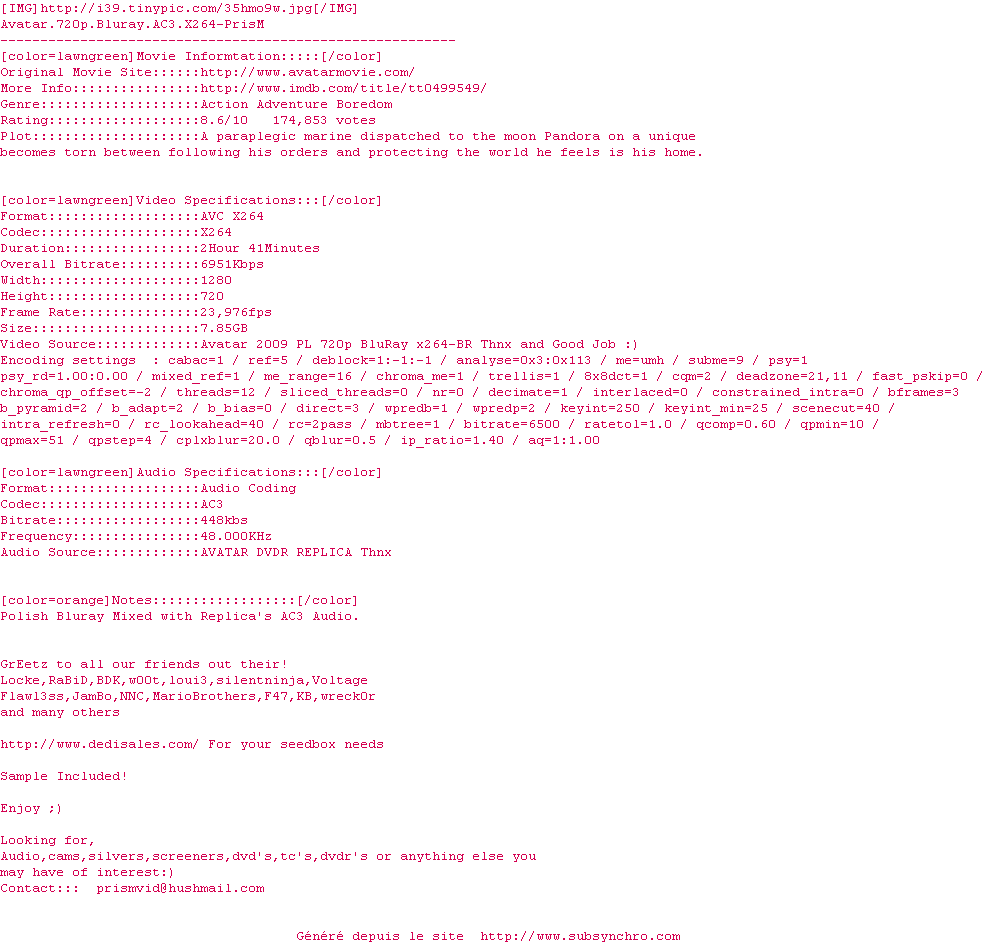 Nfo de la release Avatar.720p.Bluray.AC3.X264-PrisM