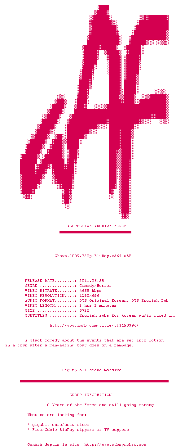 Telechargez le RSS « Fichier de la release Chawz.2009.720p.BluRay.x264-aAF »