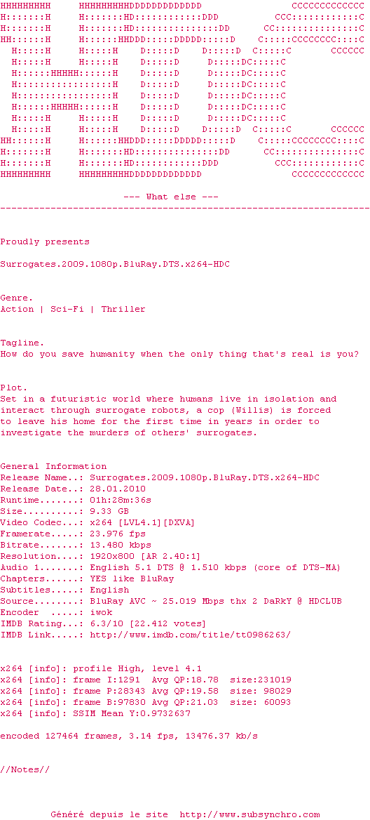 Telechargez le RSS « Fichier de la release Surrogates.2009.1080p.BluRay.DTS.x264-HDC »