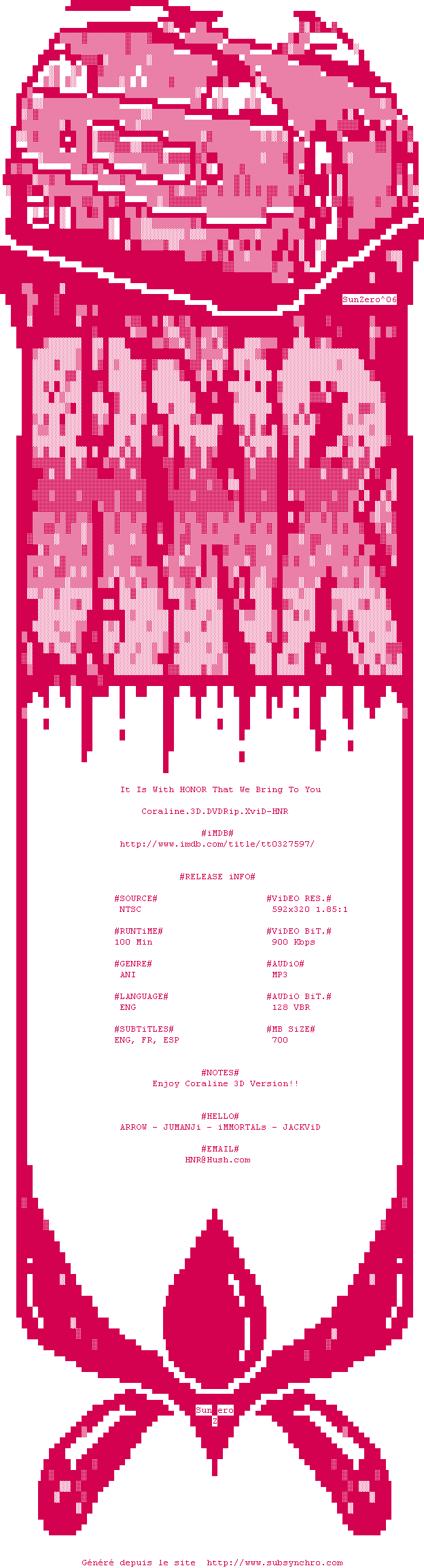 Coraline.2009.Z1.HNR.FR.srt Ajouté par Ultimhate Ajoute le 31-08-2010 16:11:47 Format : SRT Italique : Non Taille : 0.00Ko Telechargement : 51 Sous-titre Extrait d'un DVD Z1 Ajouter cette release à ma collection en cas de telechargement des sous-titres 0 0 0 Telecharger le ZiP contenant NFO, Affiche, Sous-titre (*.srt) Commentez le fichier Coraline.2009.Z1.HNR.FR.srt Commentez le fichier Coraline.2009.Z1.HNR.FR.srt Commentez ce fichier Le fichier 138-1283263930.srt n'existe pas ! Telechargez le RSS « Fichier de la release Coraline.3D.DVDRip.XviD-HNR » Retour au film « Coraline »