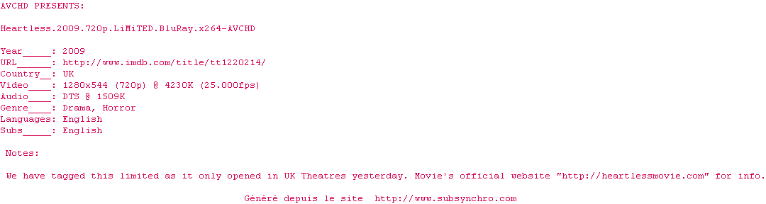 bon pour la release Heartless.2009.720p.LiMiTED.BluRay.x264-AVCHD