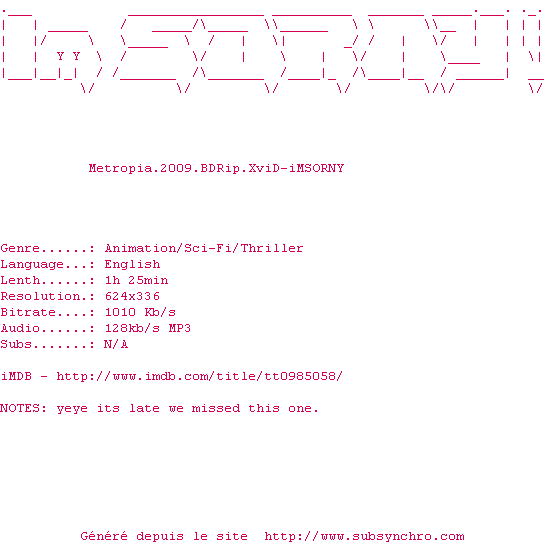 Telechargez le RSS « Fichier de la release Metropia.2009.BDRip.XviD-iMSORNY »