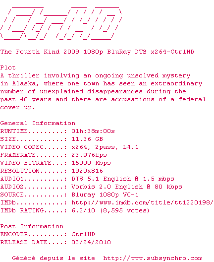 Telechargez le RSS « Fichier de la release The.Fourth.Kind.2009.1080p.BluRay.DTS.x264-CtrlHD »