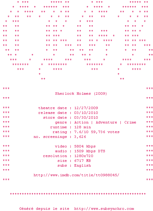 Telechargez le RSS « Fichier de la release Sherlock.Holmes.720p.Bluray.x264-CBGB »
